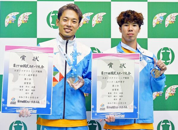 第79回国民スポーツ大会「わたSHIGA輝く国スポ」(滋賀国スポ)で5日、佐賀県勢はスポーツクライミング成年男子リードの樋口純裕選手(クライミングジムPUMP2)と通谷律選手(佐賀県山岳・スポーツクライミング連盟)のペアが頂点に立ち、県勢として同種目の大会3連覇を達成した。陸上成年男子走り幅跳びの山川夏輝(チームSSP)は7メートル77で優勝した。