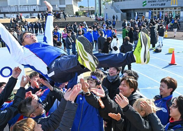 王座奪還を果たし、小松久幸監督を胴上げするSUMCO伊万里の選手たち=唐津市陸上競技場