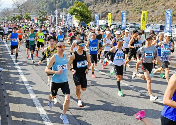 第73回公認鹿島祐徳ロードレース大会(佐賀陸上競技協会・鹿島市スポーツ協会主催、佐賀新聞社など共催)が22日、鹿島市林業体育館前から嬉野市塩田町を折り返すコースであった。ハーフマラソンと3キロ中学生に約650人が出場し、早春の肥前路を駆け抜けた。