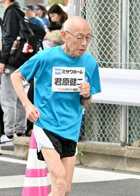 第1回から参加する君原さんは、85歳の節目に「今年が最後」と決めて大会に臨んだ。腕時計で冷静にタイムを確認しながら自分のペースを維持し、約1時間20分で完走。「沿道からの温かい声援に励まされ、良いタイムで走れた」と柔らかい笑みを浮かべ、ラストランを終えた。