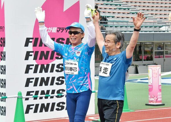 栁川さんは10年以上伴走者を務める渡邉啓一さん(70)に肩を支えられ、ゴールにたどり着いた。「花粉症で苦しくて」と苦笑いしつつ、「ここでしか会えない全国のランナー仲間と再会できてうれしかった。80歳まで頑張る」と語った。(上田遊知)